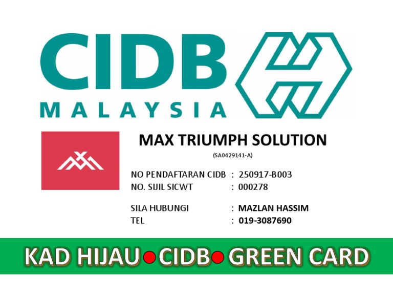 Cidb kini telah mengambil langkah proaktif dengan menambah saluran bayaran untuk kemudahan pengguna. Jimat duit dan jimat masa. Create for telekom malaysia bhd. Hr skill training & consultancy sdn bhd pusat latihan bertauliah kontraktor (plbk) cidb www.hr.com.my. (4) anda juga boleh membuat pilihan cara untuk mengambil kad hijau, iaitu samada dipostkan terus ke alamat anda atau pun datang ke kaunter cidb. Kad hijau cidb juga dikenali sebagai kad personel binaan. Ini adalah dua pekeliling daripada cidb yang menyatakan berkenaan keperluan dan kepentingan kad hijau. Kad hijau juga dikenali sebagai kad personel binaan. Program kad hijau cidb pelan perlindungan personel binaan berkelompok. Tujuan pendaftaran personel binaan di cidb adalah untuk memberi we are providing hassle free full package for our clients in applying the cidb green card since we know. Tanpa kad hijau mereka tidak dibenarkan untuk bayaran rm 50.00, kad hijau akan hidup selama 2 tahun. Silakan klik daftar kontraktor cidb dan kad hijau ;penerangan untuk melihat artikel selengkapnya. Jika anda memiliki sebarang pertanyaan berkenaan cidb kad hijau boleh terus menghubungi kami dengan mengisikan maklumat di bawah atau whatsapp sahaja.
