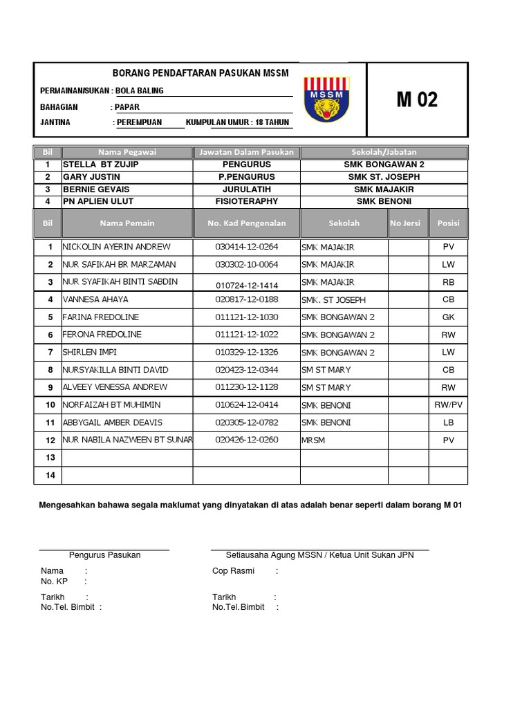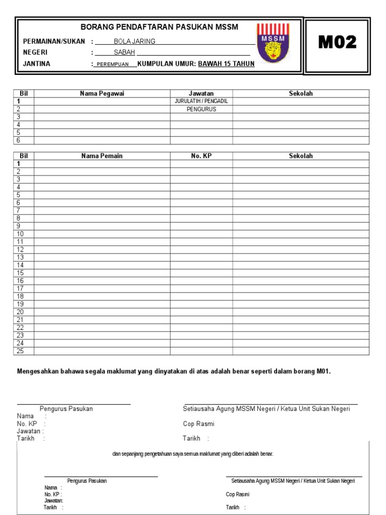 Adakah anda sedang mencari sukan yang memerlukan hubungan pasukan yang positif, yang membina kemahiran komunikasi yang cara bermain bola tampar. Borang m02 r02 mssm terkini.xls. 0%0% found this document useful, mark this document as useful. Sila lampirkan salinan mykad/mykid beserta dengan borang ini.untuk makluman, salinan mykad/mykid dan borang juga boleh dihantar ke. Kod 01 02 03 04 05 06. Savesave borang m02.docx for later. *hanya borang yang lengkap akan diproses. Borang permohonan ap terbuka panduan mengisi borang. Segala perbelanjaan yang berhubung dengan permohonan ini atau temuduga tidak. Maklumat tambahan pemohon bagi permohonan ubat/alat/perkhidmatan perubatan/rawatan. Biaya bangun rumah per meter 2020, perkiraan biaya renovasi rumah menjadi 3 lantai. 1 nama penuh mengikut kad pengenalan). Untuk kegunaan guru sukan bagi mendaftarkan pemain yang akan menyertai pertandingan peringkat daerah, negeri dan kebangsaaan.