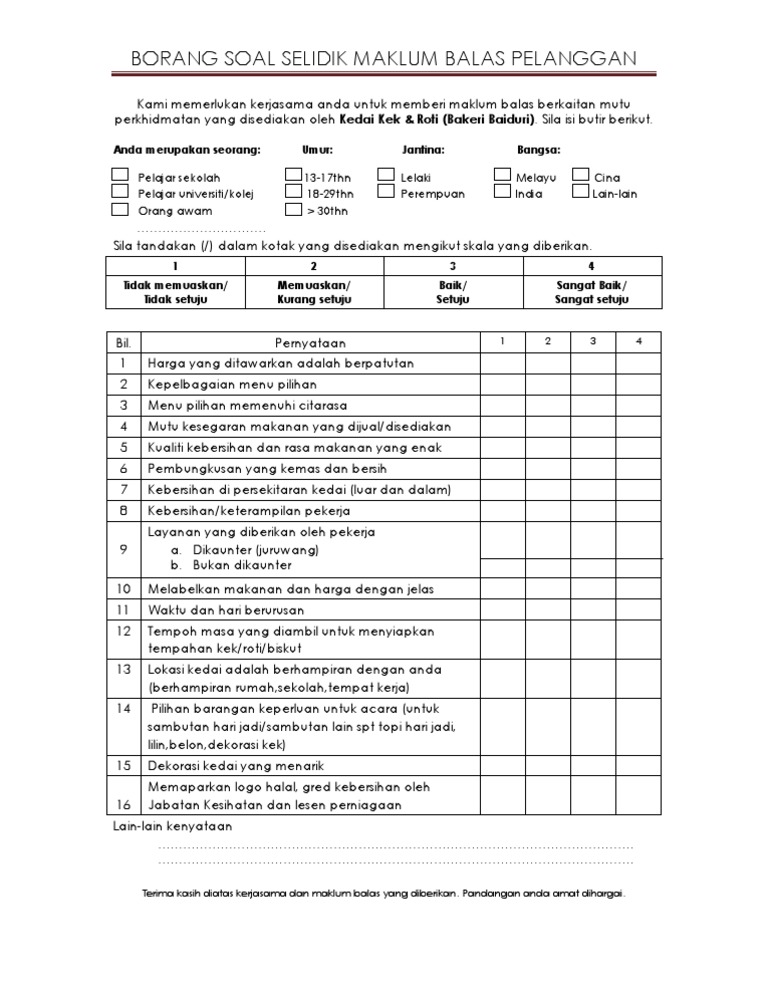 Faktor penyumbang kepada tekanan perumahan. Contoh borang soal selidik keperluan latihan from image.slidesharecdn.com. Perkongsian cara membina jadual kerja untuk proses kerja lapangan mengikut masa yang ditetapkan iaitu selama dua minggu. Maklumat ini akan menolong penyelidik menganalisis maklum balas anda. Add to collection(s) add to saved. 18 tahun 23 tahun b. Borang soal selidik tajuk kajian: Contoh dan penerangan objektif : Kaedah pengajaran yang sesuai mengikut konsepsi pengajaran bahagian a di dalam bahagian ini, anda dikehendaki memberi maklumat mengenai latar belakang anda. Respon pelajar terhadap pengajaran guru bahagian a: Pusat operasi murninets kebangsaan (pomk), planmalaysia sedang melaksankan kajian soal selidik dibawah program jaringan penunjuk pembangunan mampan bandar luar bandar malaysia (murninets), planmalaysia, kementerian wilayah. Borang soal selidik by rosnani ghazali 100638 views. 19441024 borang soal selidik tentang gaya hidup sihat.