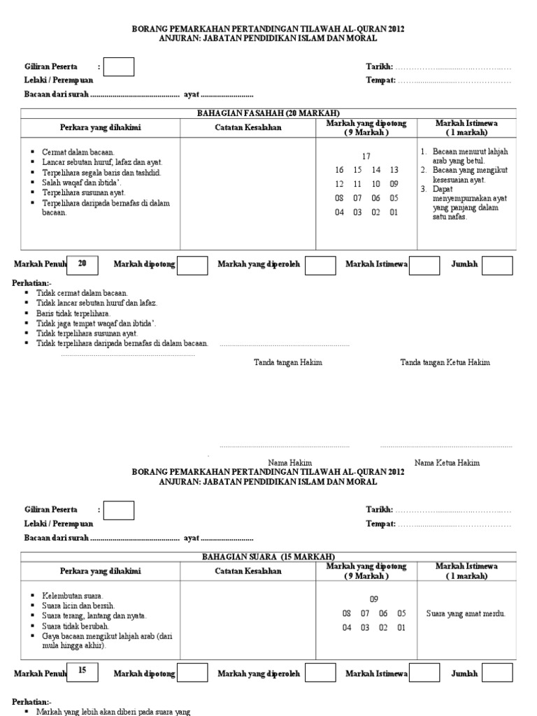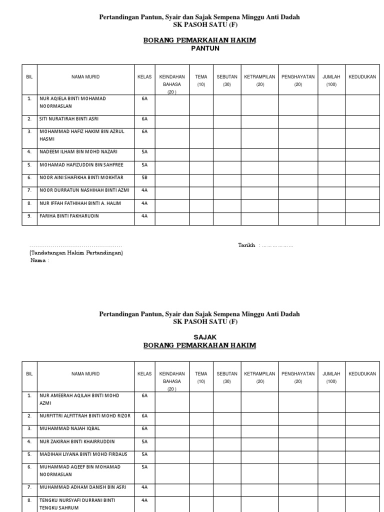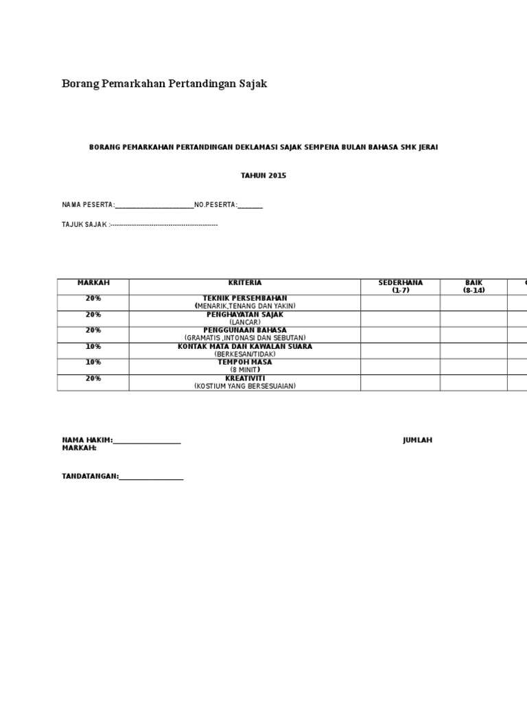Related : Contoh Borang Pemarkahan Pertandingan Sajak : Borang Pemarkahan Pertandingan Deklamasi Sajak : Borang pemarkahan pertandingan kawad kaki sispa hanya untuk hakim sahaja 4 11 3.10..