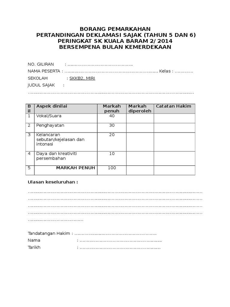 Translate · borang pemarkahan pertandingan mendeklamasikan sajak aliran tahun 4 sempena bulan kemerdekaan 2014 sk.