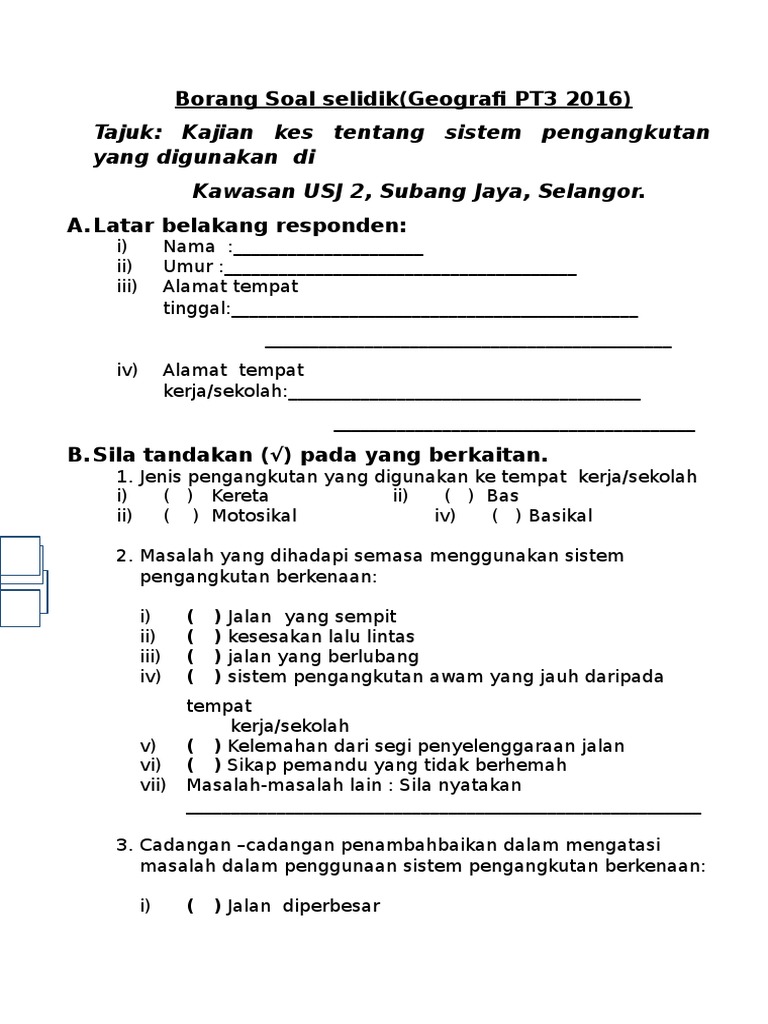 Konsep dan takrifan sistem pengangkutan. Contoh borang soal selidik tugasan pt3 geografi. Pt3 yang diperkenalkan pada tahun 2014 membuka lembaran baharu apabila tiada lagi soalan objektif dalam ujian bertulis bagi semua mata pelajaran, sebaliknya. Text of borang soal selidik geografi pt3 2015. Di bawah ini adalah contoh borang soal selidik sejarah pt3 2016 yang boleh anda jadikan sebagai skrip ketika melakukan temubual kelak. Contoh borang soal selidik geografi 2021 tingkatan 3. ** anda dilarang meniru borang ini 100 % kerana dikhuatiri akan menjejaskan peluang anda untuk mendapat a. Contoh borang soal selidik tentang kes pengangkutan wall ppx geografi pt3 2017 nah terbaik kaedah kajian guna tanah. Halaman pertama borang soal selidik boleh. Sebanyak 200 sukarelawan (bilangan respondens) di taman cheras kuala lumpur (tempat tinggal anda) telah terlibat dengan soal selidik yang telah. Data kaji selidik penghayatan pembudayaan nilai kaji selidik 2018/data kaji selidik.data kaji selidik. Soalan pt3 geografi (1) i got %%score%% of %%total%% right. Kaedah kajian yang digunakan dalam tugasan ini adalah borang soal selidik.