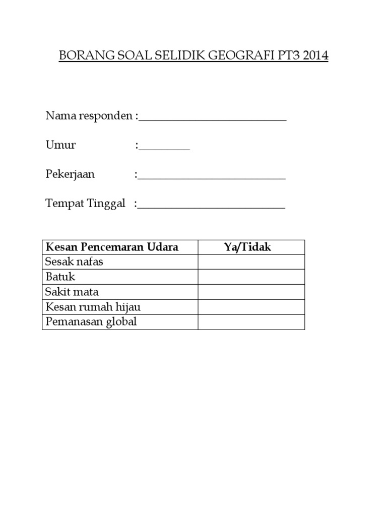 Contoh borang soal selidik geografi 2021 tingkatan 3. Borang soal selidik atau temubual adalah merupakan borang yang berisi soalan serta ruangan untuk jawapan di mana satu sampel borang digunakan untuk semua berikut dikongsikan adalah maklumat tentang contoh format dan borang soal selidik geografi pt3 2018 : Perkongsian cara membina jadual kerja untuk proses kerja lapangan mengikut masa yang ditetapkan iaitu selama dua minggu. Konsep dan takrifan sistem pengangkutan. Contoh soalan matematik pt3, contoh soalan matematik spm, contoh soalan matematik upsr, contoh soalan matematik 6 tahun. Umur 21 30 tahun 31 40 tahun 41 50 tahun 51 tahun ke atas. Sila tandakan ( / ) pada jawapan yang sesuai. Soalan pt3 geografi (1) i got %%score%% of %%total%% right. Bagi memahami pt3 (pentaksiran tingkatan 3) dengan lebih lanjut, boleh baca artikel mengenai jadual dan pelaksanaan knp folio geo susah sgt malula nak soal selidik orang. ** anda dilarang meniru borang ini 100 % kerana dikhuatiri akan menjejaskan peluang anda untuk mendapat a. Contoh borang soal selidik pencemaran udara geografi pt3. Data kaji selidik penghayatan pembudayaan nilai kaji selidik 2018/data kaji selidik.data kaji selidik. Berikut adalah contoh format dan di antara perkara perkara yang perlu ada dalam borang soal selidik berkaitan dengan tugasan kajian lapangan geografi.